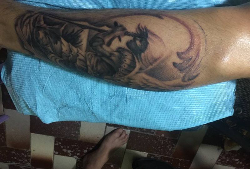 • T包小腿吹火男+阿多福纹身图片_腿部老传统新传统吹火男阿