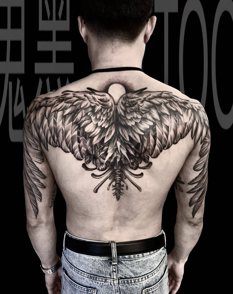 当前位置: 首页 >广东省汕头市纹身店-鬼墨刺青Tattoo纹身图案>点刺半背翅膀纹身图片_背部点刺纹身图案