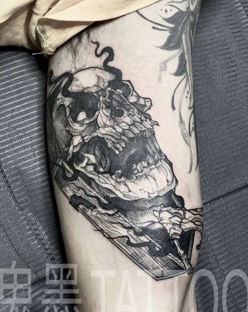当前位置: 首页 >广东省汕头市纹身店-鬼墨刺青Tattoo纹身图案>暗黑系骷髅纹身图片_手臂暗黑系纹身图案