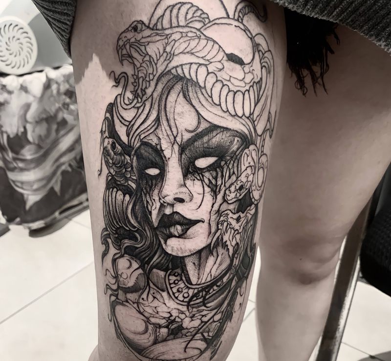 暗黑系美杜莎纹身图片_腿部暗黑系纹身图案