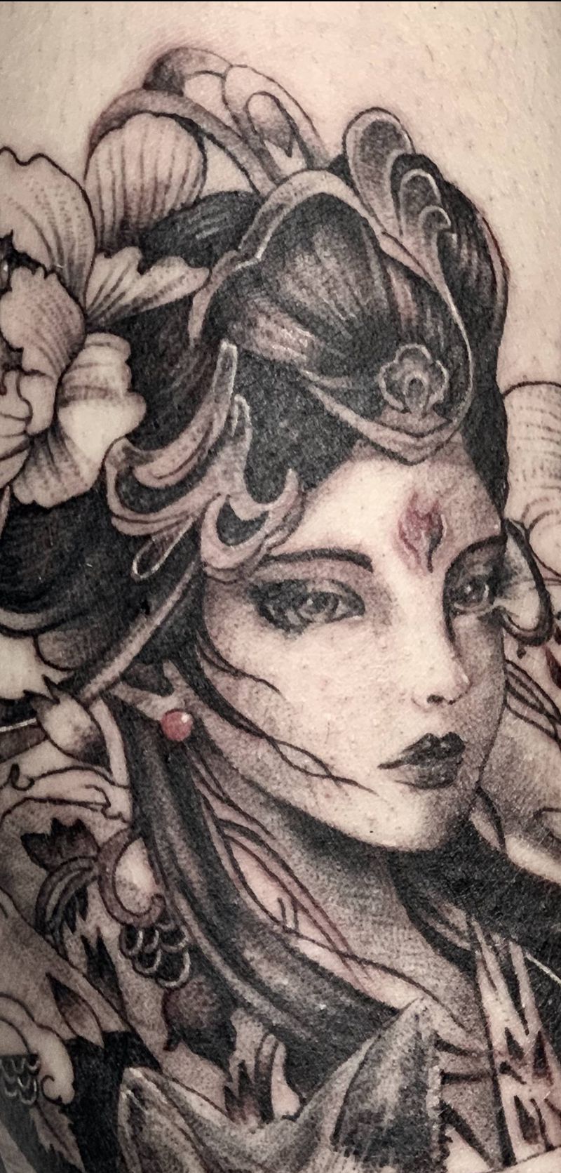 当前位置: 首页 >广东省汕头市纹身店-鬼墨刺青Tattoo纹身图案>艺伎纹身图片_脚部腿部新传统纹身图案