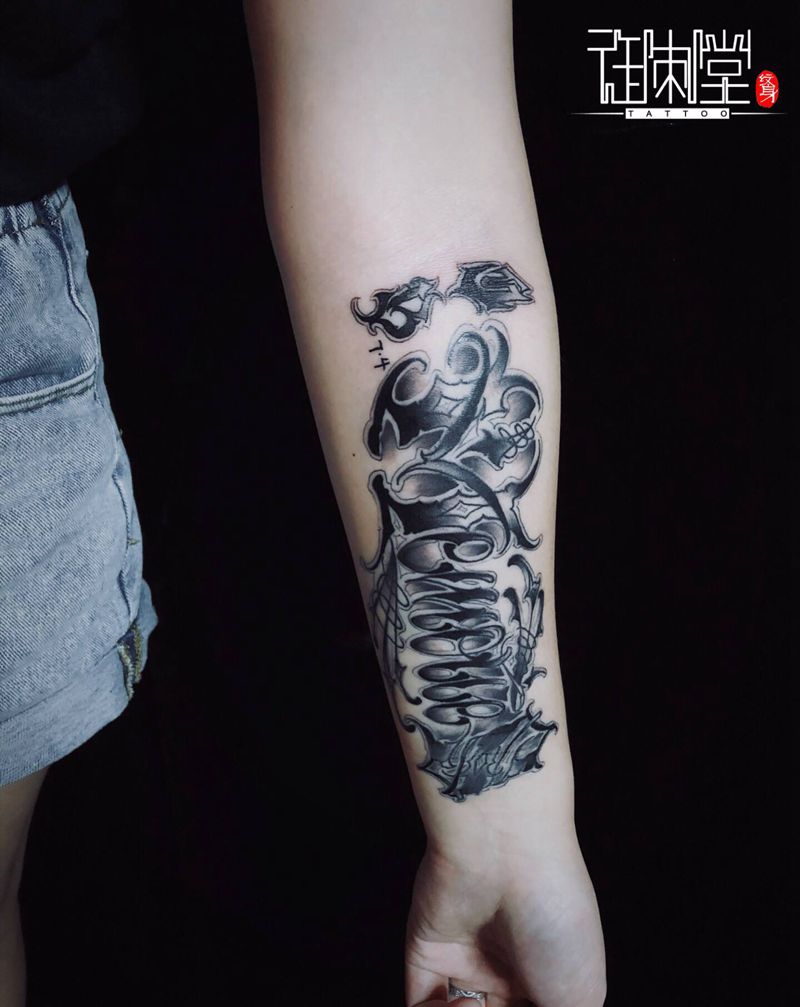 当前位置: 首页 >广东省汕头市纹身店-御刺堂纹身图案>大花体字纹身图片_手臂花体字纹身图案