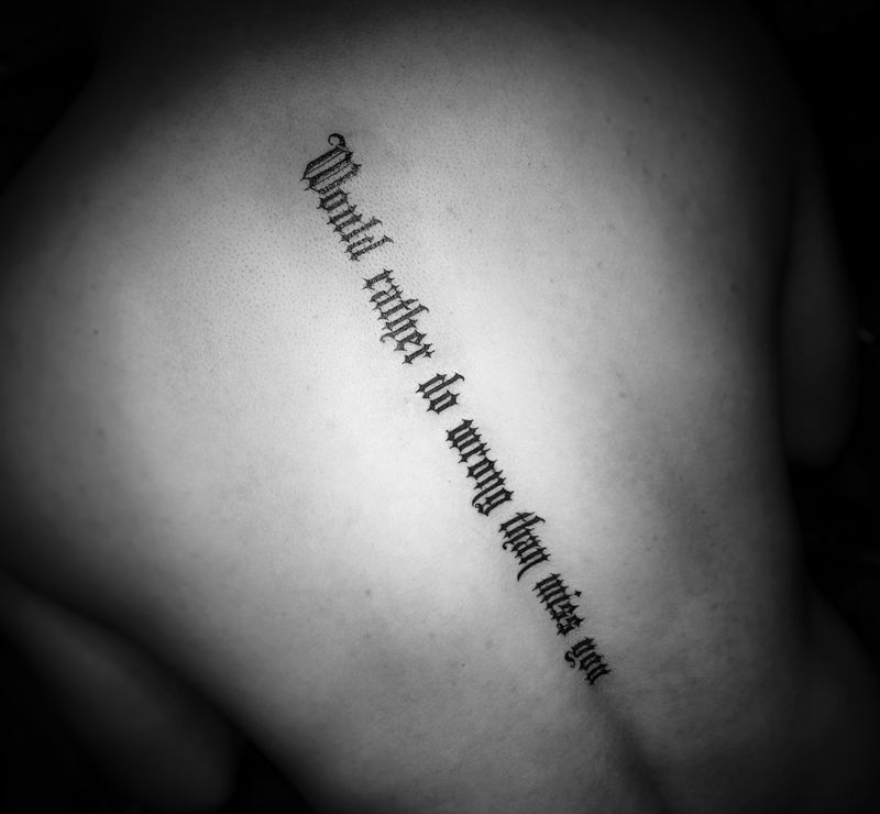 哥特纹身图片_手部背部花体字哥特英文脊椎纹身图案