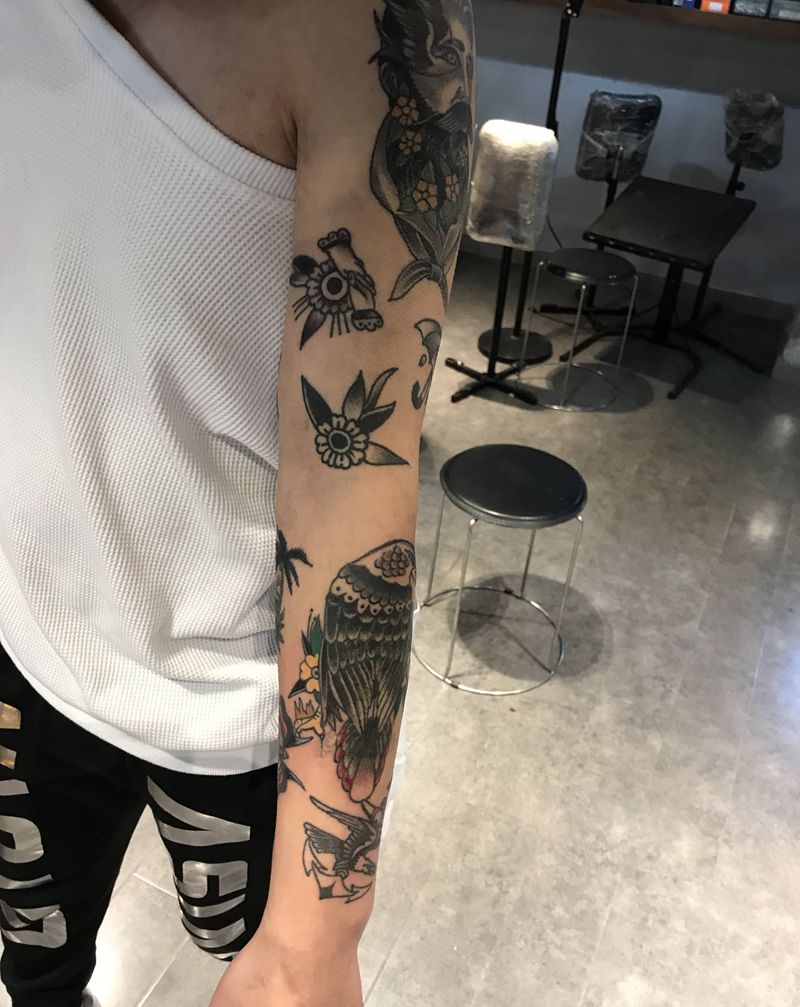 当前位置: 首页 >广东省佛山市纹身店-彫眞刺青纹身图案>拼接花臂纹身图片_手臂Old School纹身图案