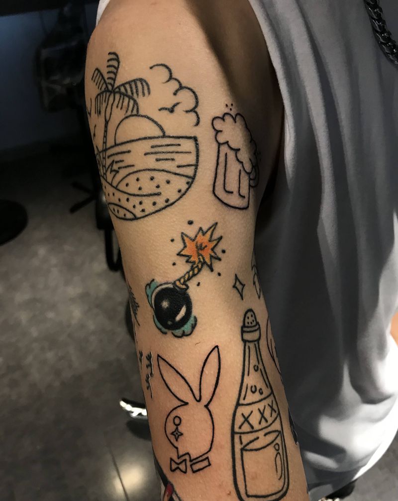当前位置: 首页 >广东省佛山市纹身店-彫眞刺青纹身图案>拼接纹身图片_手臂Old School纹身图案