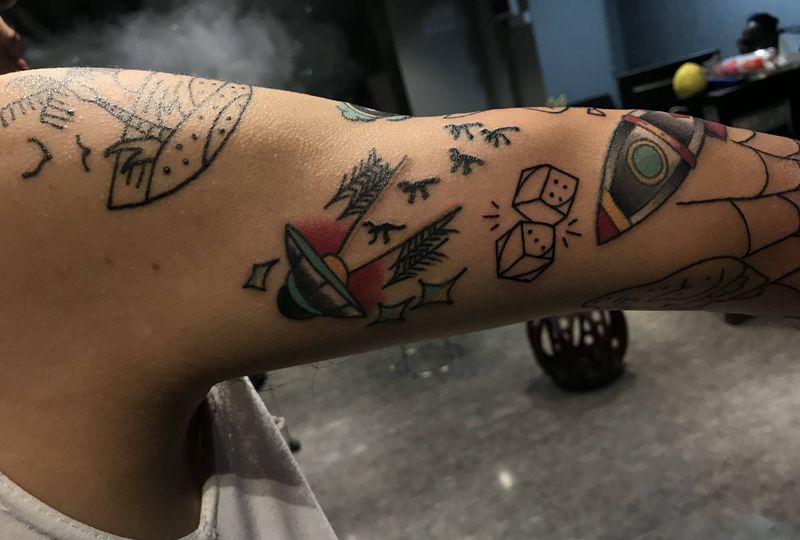 当前位置: 首页 >广东省佛山市纹身店-彫眞刺青纹身图案>拼接纹身图片_手臂Old School纹身图案