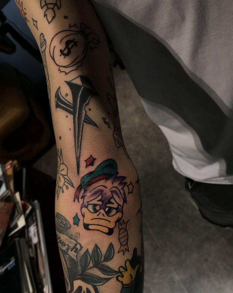 当前位置: 首页 >广东省佛山市纹身店-彫眞刺青纹身图案>拼接纹身图片_手臂Old School纹身图案