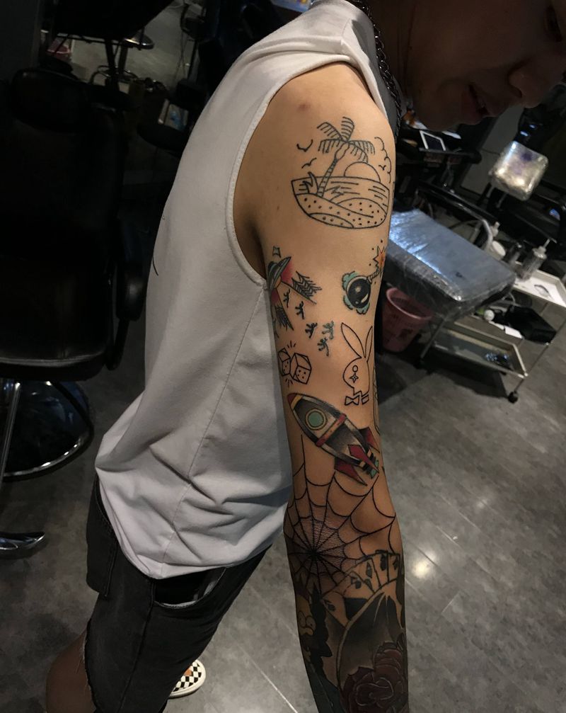 当前位置: 首页 >广东省佛山市纹身店-彫眞刺青纹身图案>拼接纹身图片_手臂Old School纹身图案