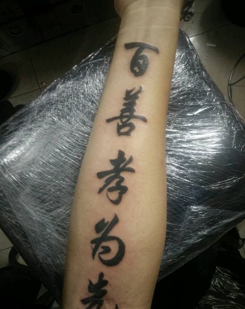 当前位置: 首页 >广东省佛山市纹身店-彫眞刺青纹身图案>百善孝为先纹身图片_手臂传统字符图腾成品纹身图案