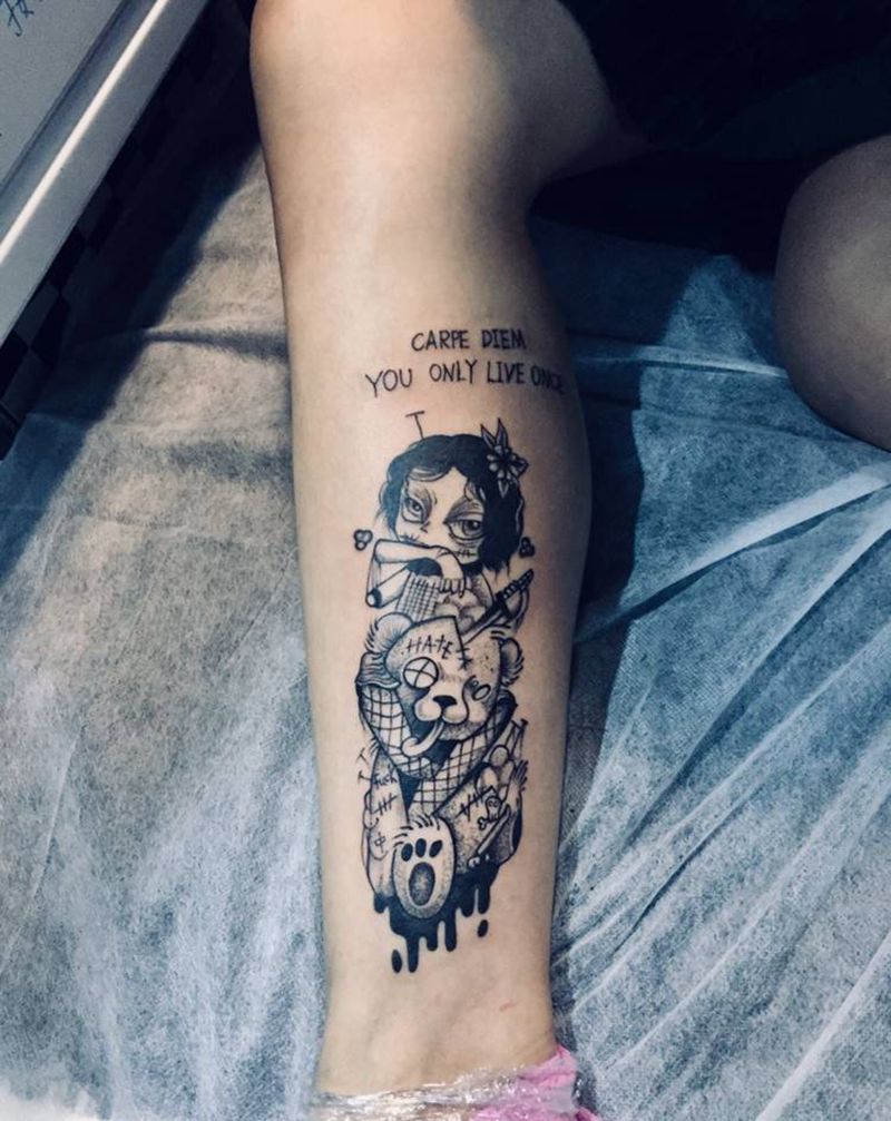 当前位置: 首页 >广东省佛山市纹身店-西樵鲤狮虎刺青纹身图案>人偶纹身图片_腿部纹身图案