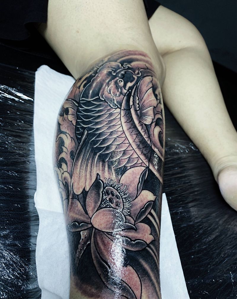 小腿鲤鱼纹身图片_腿部新传统纹身图案