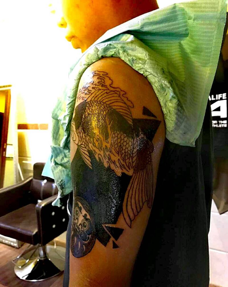 当前位置: 首页 >广东省湛江市纹身店-宁少TATTOO纹身图案>鲤鱼+达摩蛋=覆盖纹身图片_手臂成品纹身图案