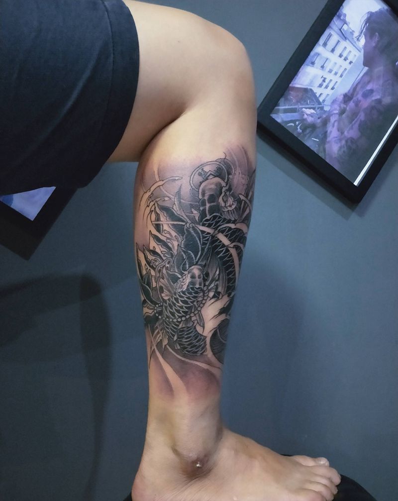 • T网红王老大花腿龙纹身图片_腿部新传统纹身图案