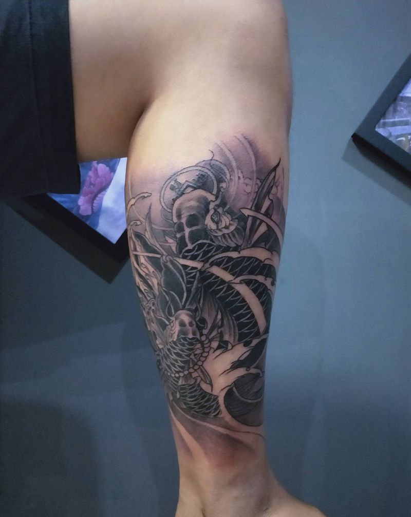 • T网红王老大花腿龙纹身图片_腿部新传统纹身图案