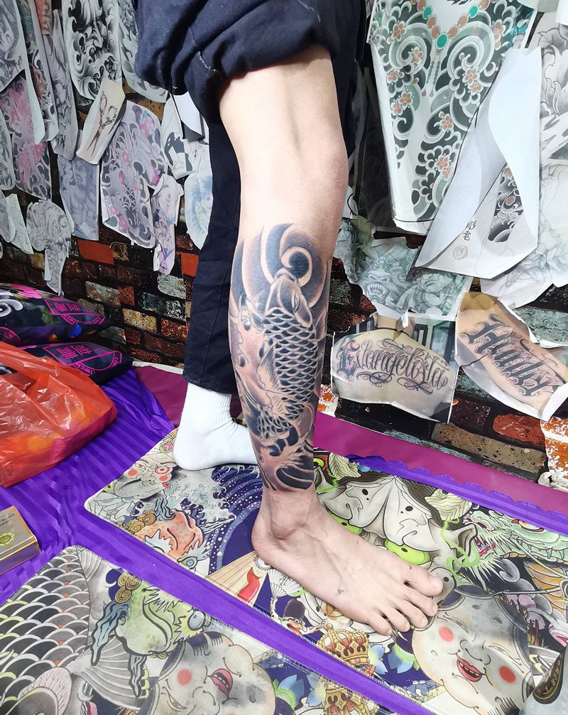 • T网红王老大花腿龙纹身图片_腿部新传统纹身图案