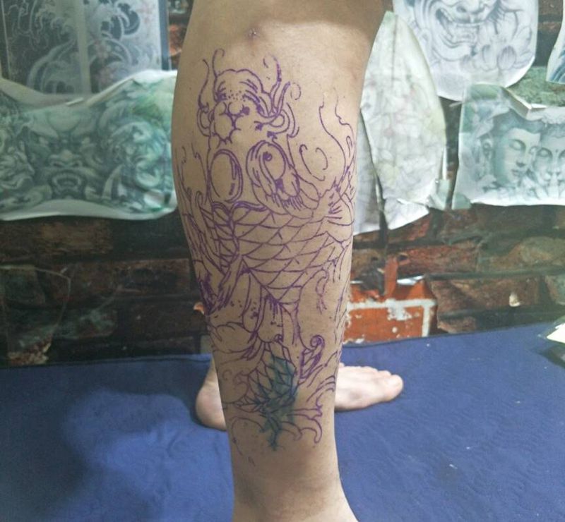 • T网红王老大花腿龙纹身图片_腿部新传统纹身图案