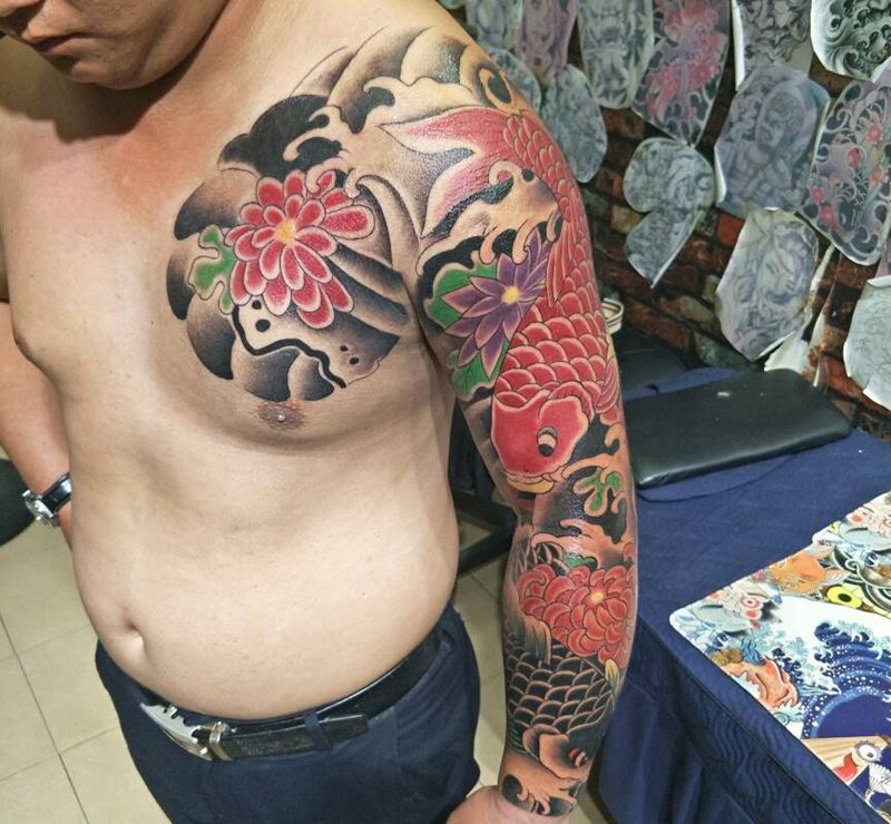 当前位置: 首页 >广东省湛江市纹身店-雷州【神工纹艺】纹身图案>传统锦鲤纹身图片_手臂胸部纹身图案
