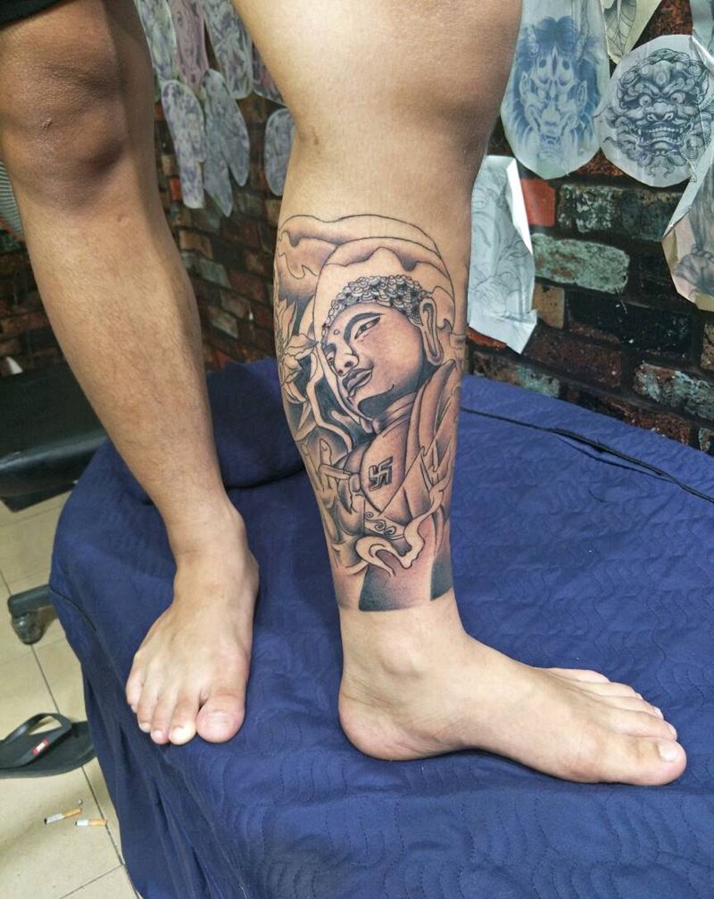 当前位置: 首页 >广东省湛江市纹身店-雷州【神工纹艺】纹身图案>修改、添加上色作品纹身图片_腿部纹身图案