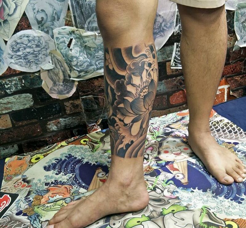 荷花纹身图片_腿部纹身图案