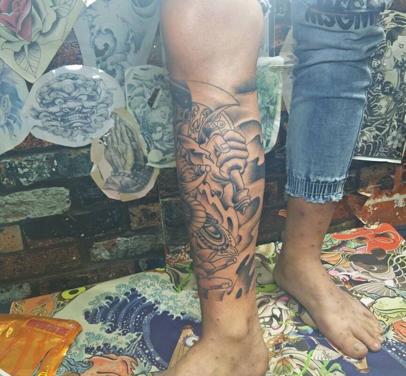 当前位置: 首页 >广东省湛江市纹身店-雷州【神工纹艺】纹身图案>象神纹身图片_脚部腿部纹身图案