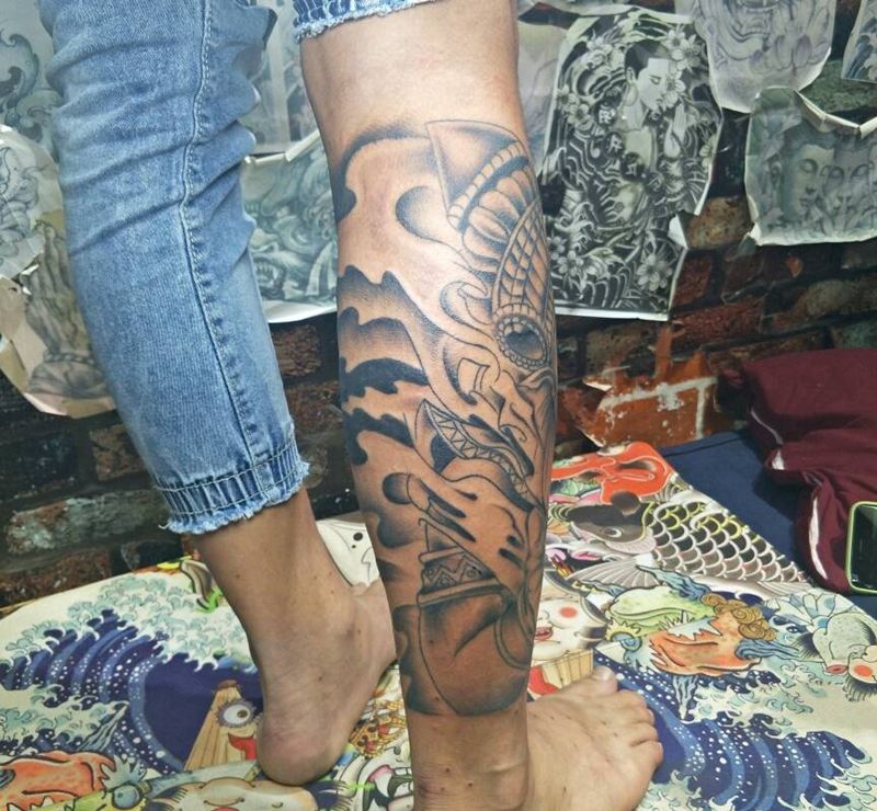 • T网红王老大花腿龙纹身图片_腿部新传统纹身图案