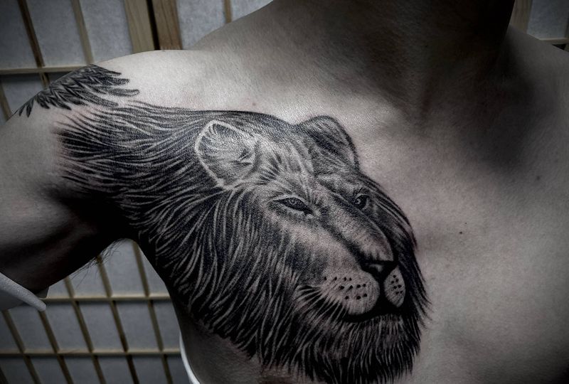 当前位置: 首页 >广东省茂名市纹身店-营刺青工作室纹身图案>狮子纹身图片_胸部纹身图案
