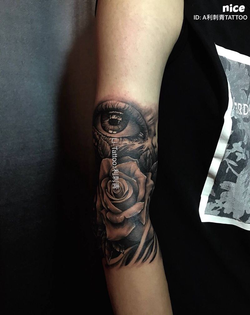 • 手背潮流时尚的玫瑰花眼睛纹身图案