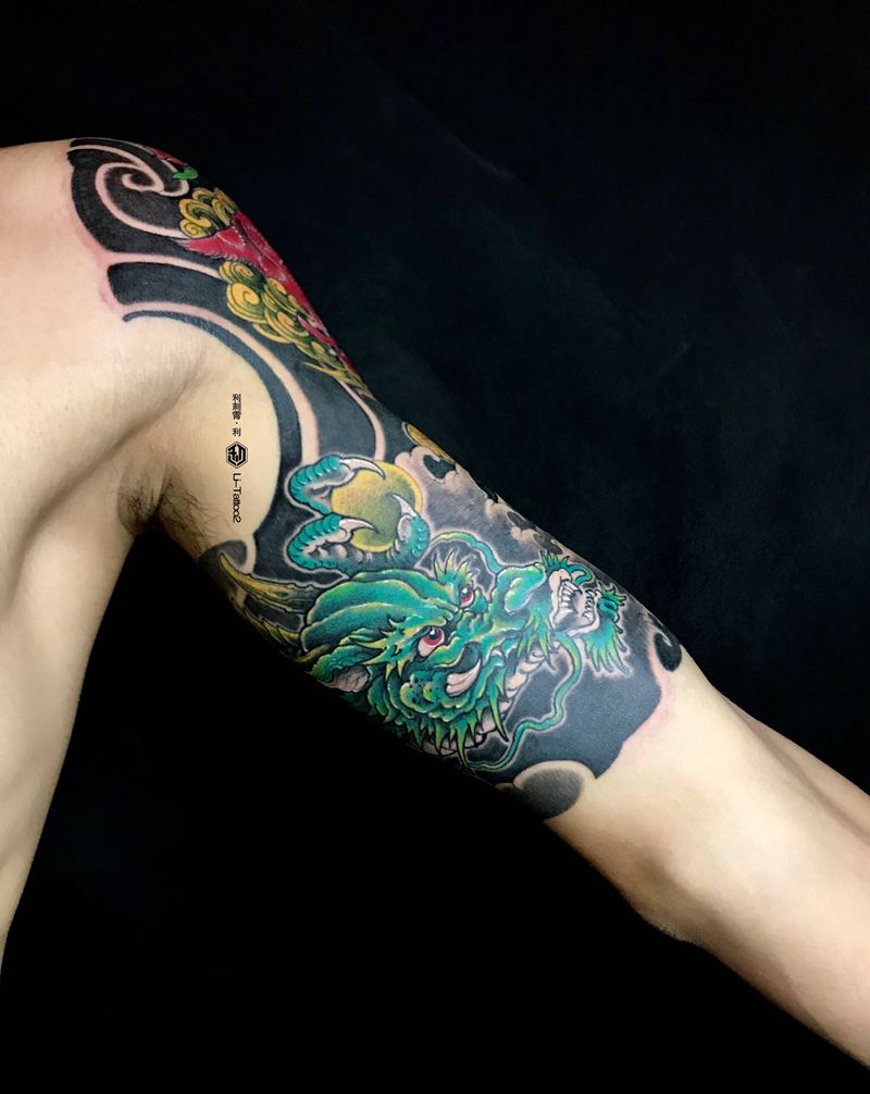 • T网红王老大花腿龙纹身图片_腿部新传统纹身图案
