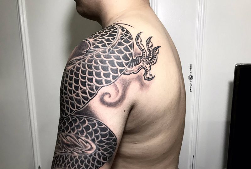 过肩龙修改纹身图片_胸部手臂老传统纹身图案