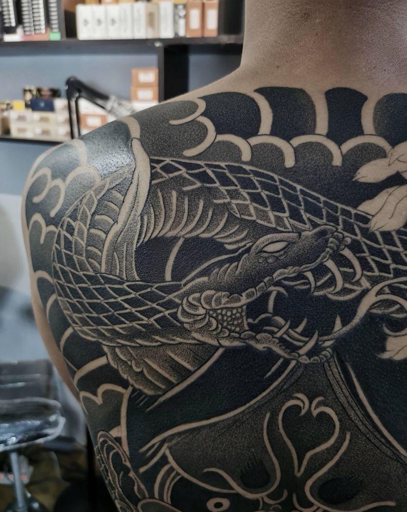 当前位置: 首页 >广东省惠州市纹身店-惠州刺匠纹身纹身图案>般若蛇局部纹身图片_背部老传统纹身图案