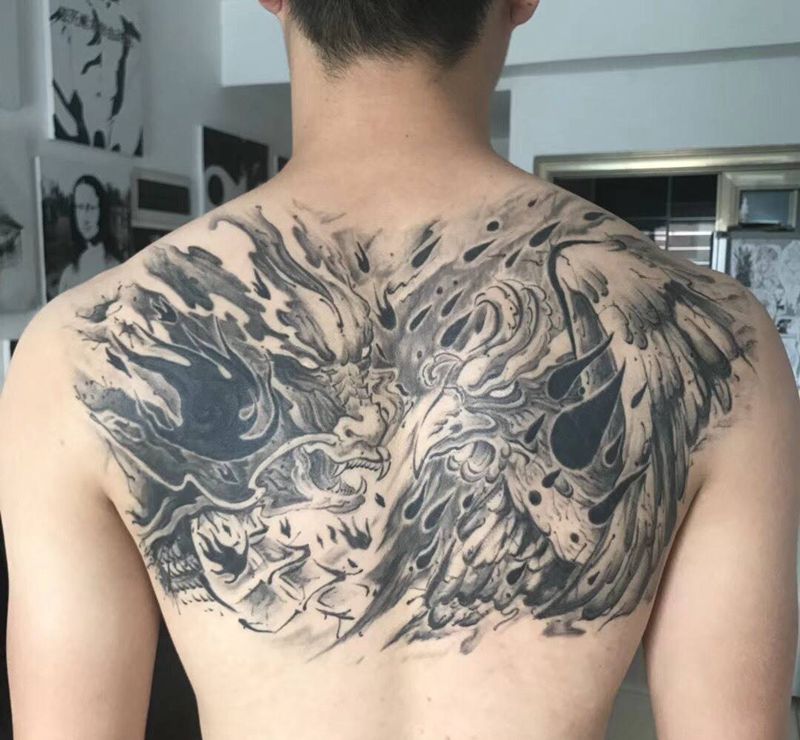 当前位置: 首页 >广东省惠州市纹身店-貳拾捌紋身工作室纹身图案>龙与凤纹身图片_成品背部传统纹身图案