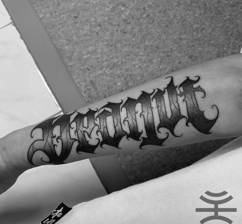 当前位置: 首页 >广东省惠州市纹身店-貳拾捌紋身工作室纹身图案>花体字纹身图片_手臂花体字纹身图案
