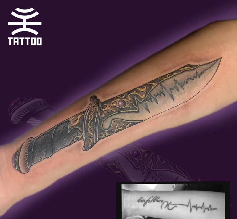 当前位置: 首页 >广东省惠州市纹身店-貳拾捌紋身工作室纹身图案>匕首覆蓋纹身图片_手臂纹身图案