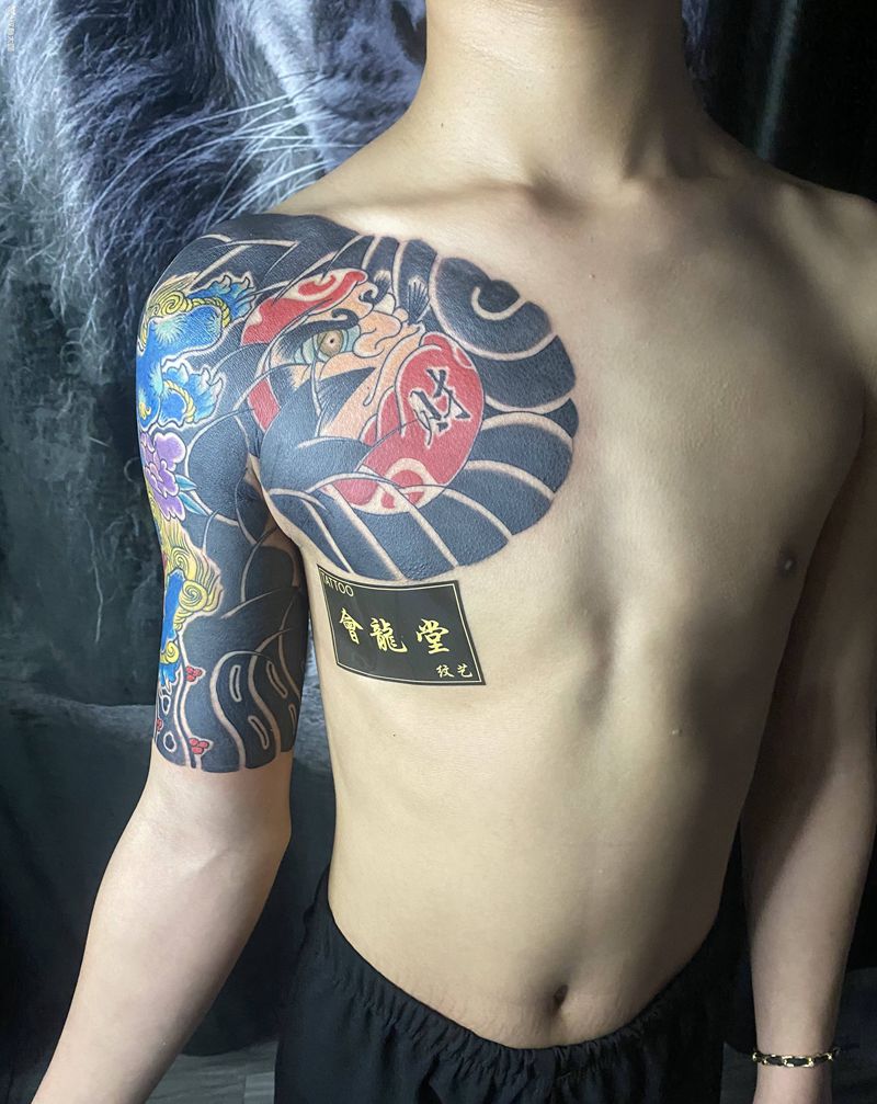 当前位置: 首页 >广东省惠州市纹身店-会龙堂纹艺纹身图案>半胛纹身图片_胸部手臂老传统纹身图案