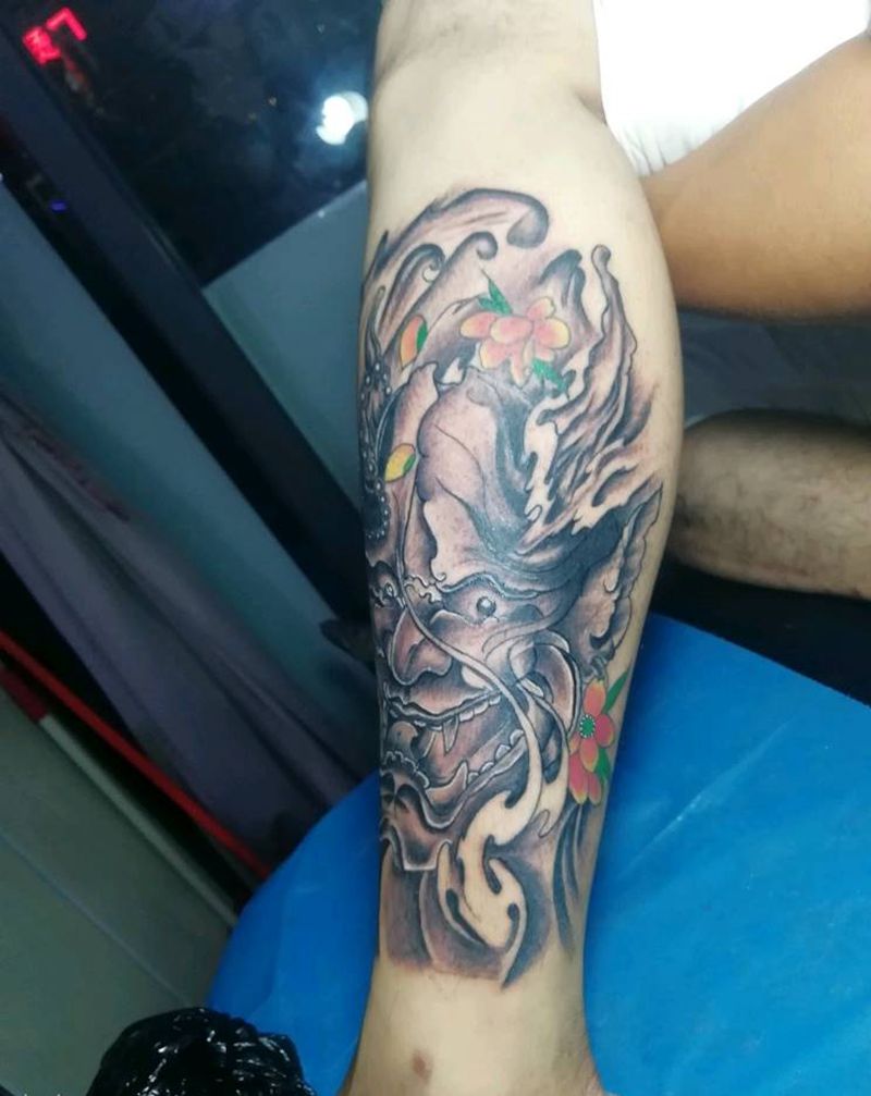 当前位置: 首页 >广东省惠州市纹身店-会龙堂纹艺纹身图案>般若小腿纹身。纹身图片