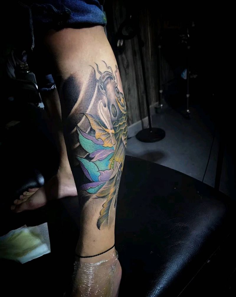 莲花鲤鱼完美结合。纹身图片_腿部新传统纹身图案