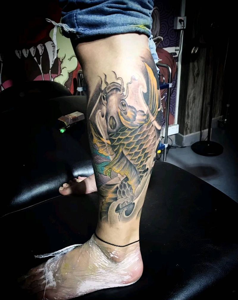 莲花鲤鱼完美结合。纹身图片_腿部新传统纹身图案