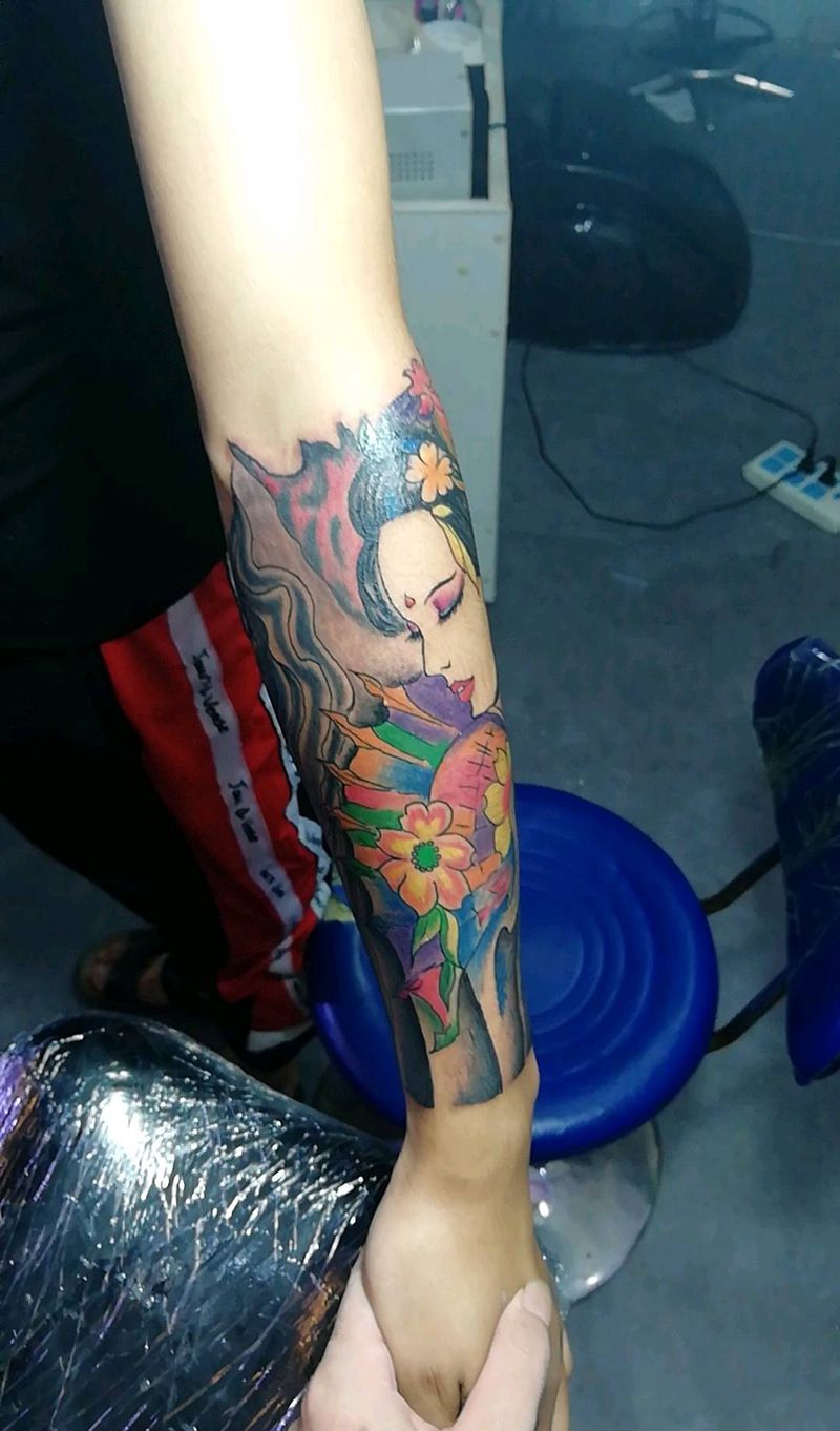 当前位置: 首页 >广东省惠州市纹身店-会龙堂纹艺纹身图案>艺妓小包臂纹身图片