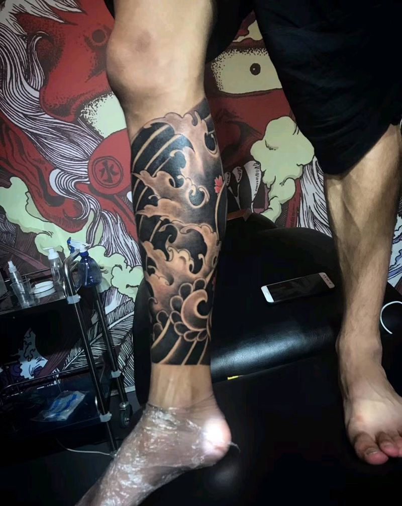 包小腿纹身图片_腿部新传统暴力遮盖。纹身图案