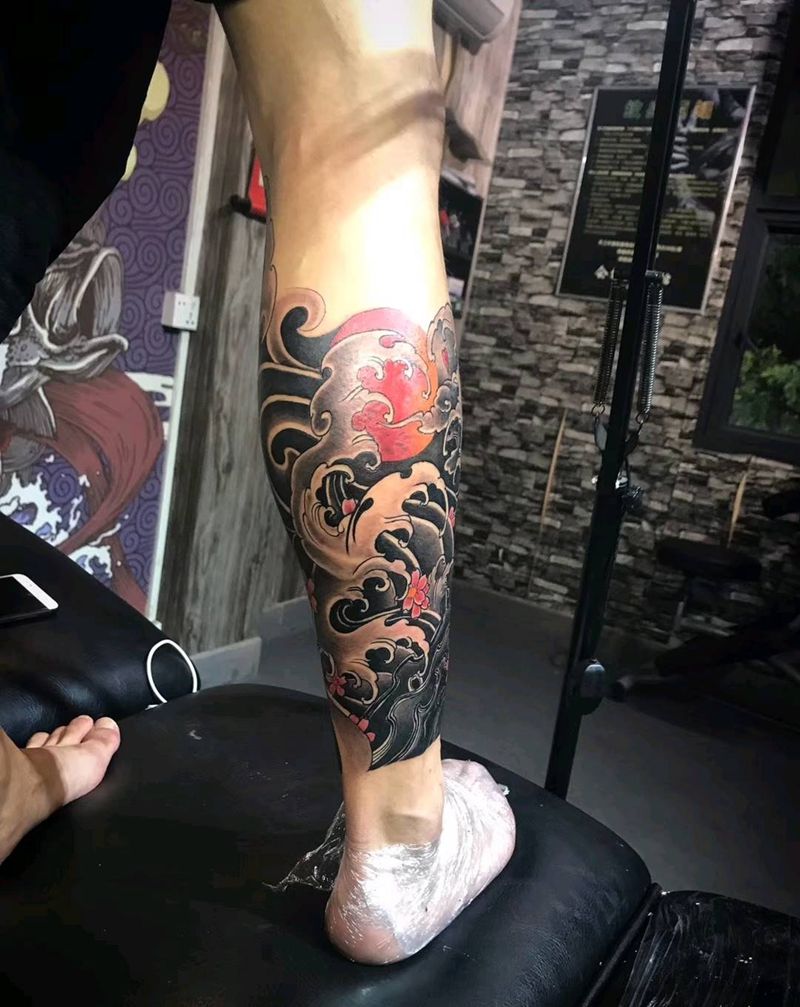包小腿纹身图片_腿部新传统暴力遮盖。纹身图案
