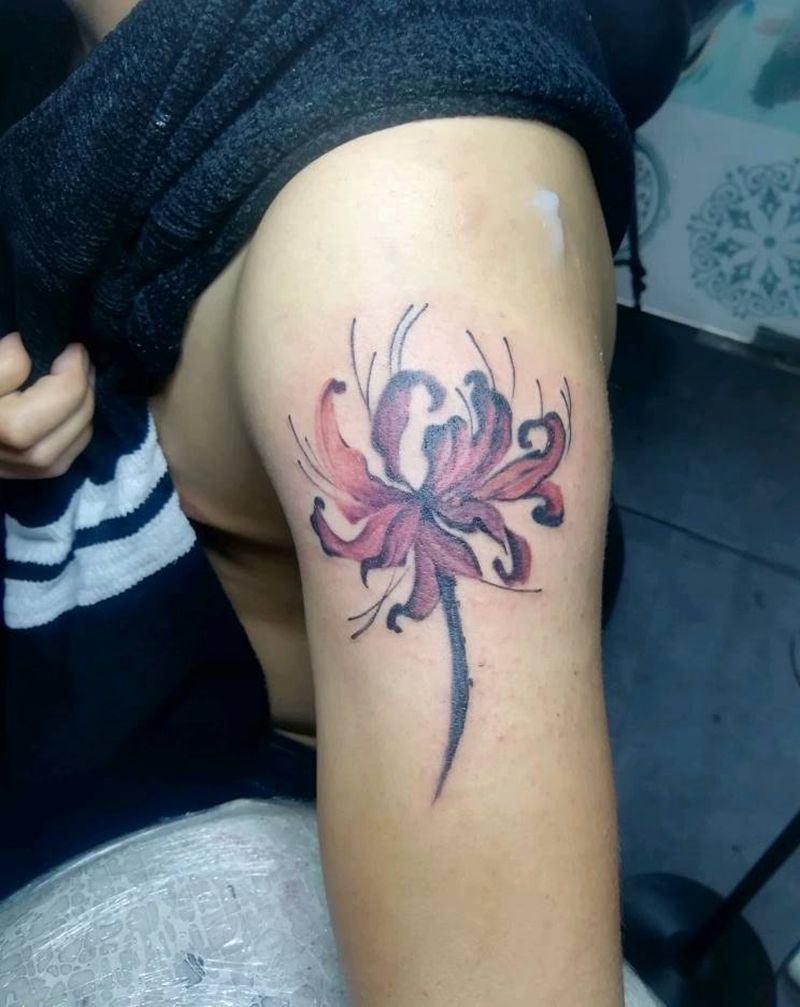 当前位置: 首页 >广东省惠州市纹身店-会龙堂纹艺纹身图案>彼岸花纹身图片_手臂水墨纹身图案