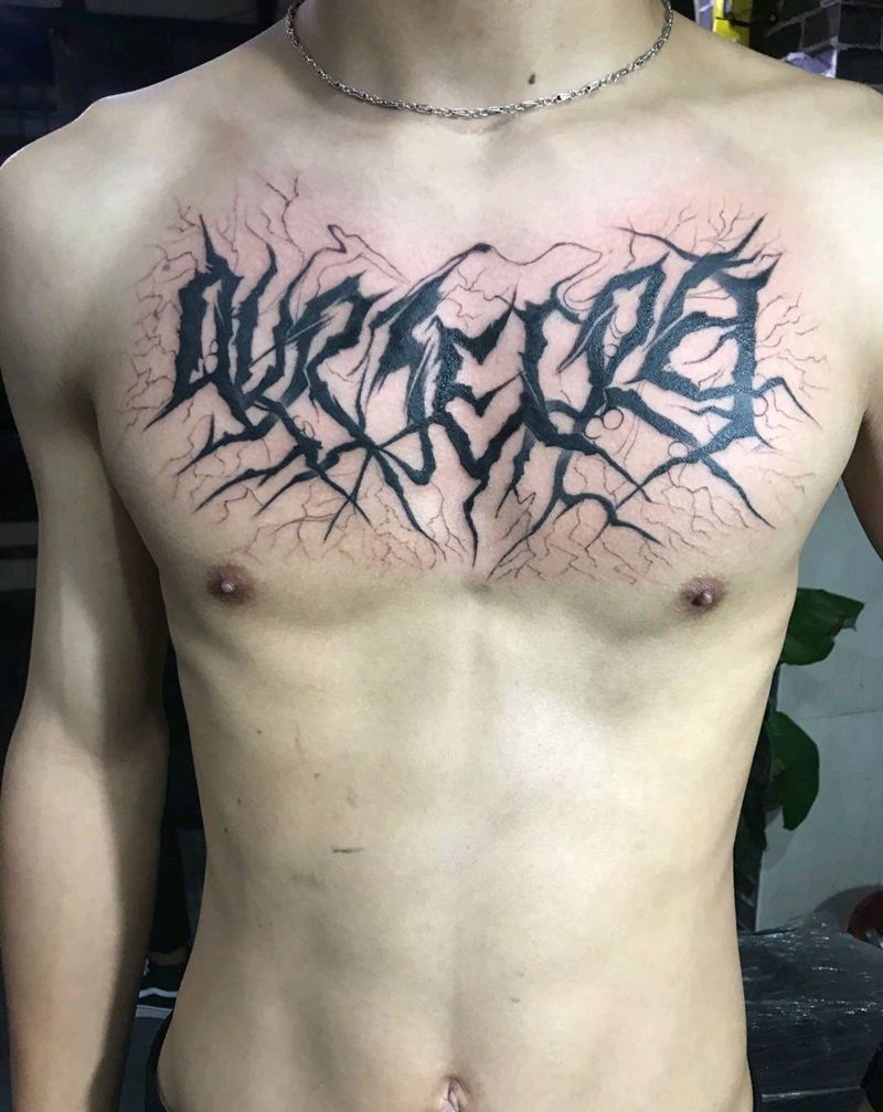 当前位置: 首页 >广东省惠州市纹身店-会龙堂纹艺纹身图案>暗黑系列花体英文纹身图片_胸部花体字新传统纹身图案