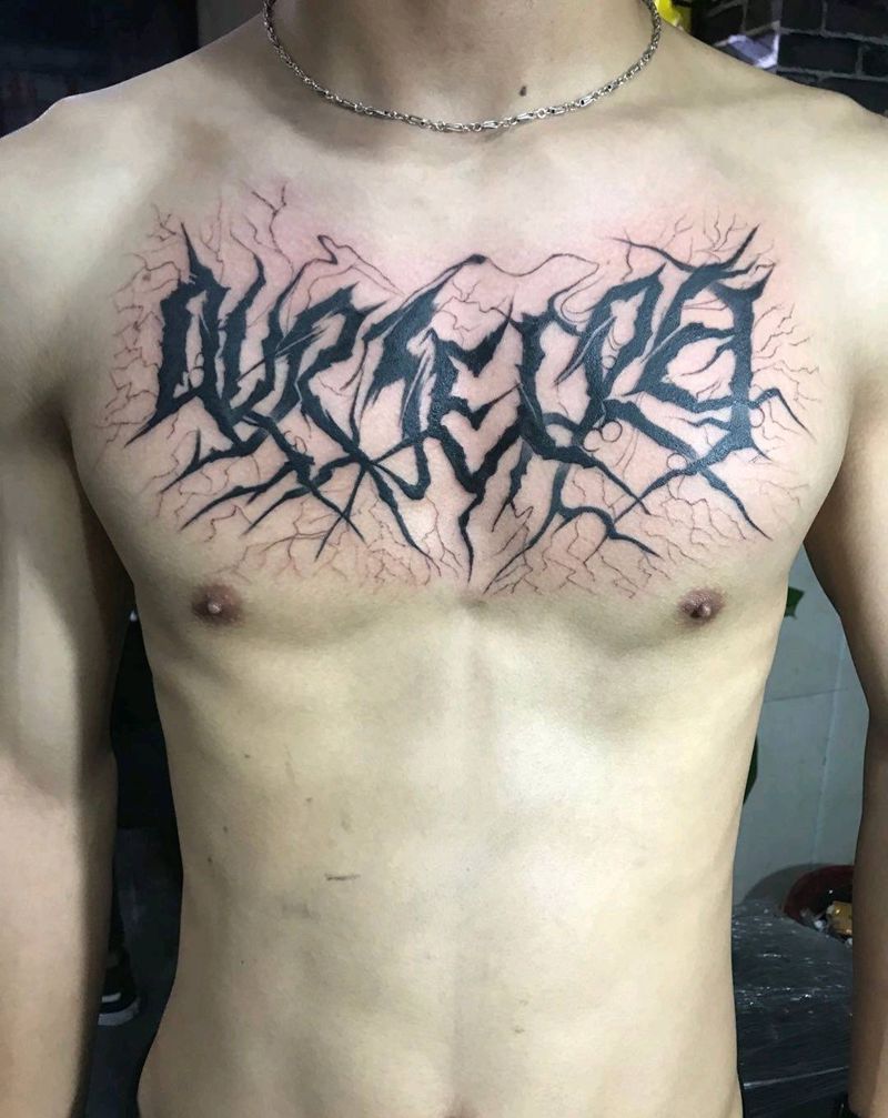 当前位置: 首页 >广东省惠州市纹身店-会龙堂纹艺纹身图案>暗黑系列花体英文纹身图片_胸部花体字新传统纹身图案