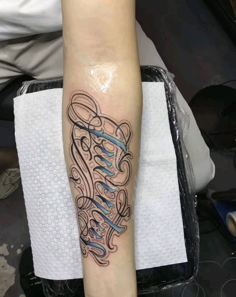 当前位置: 首页 >广东省惠州市纹身店-会龙堂纹艺纹身图案>卡奇诺英文花体字纹身图片_手臂新传统纹身图案