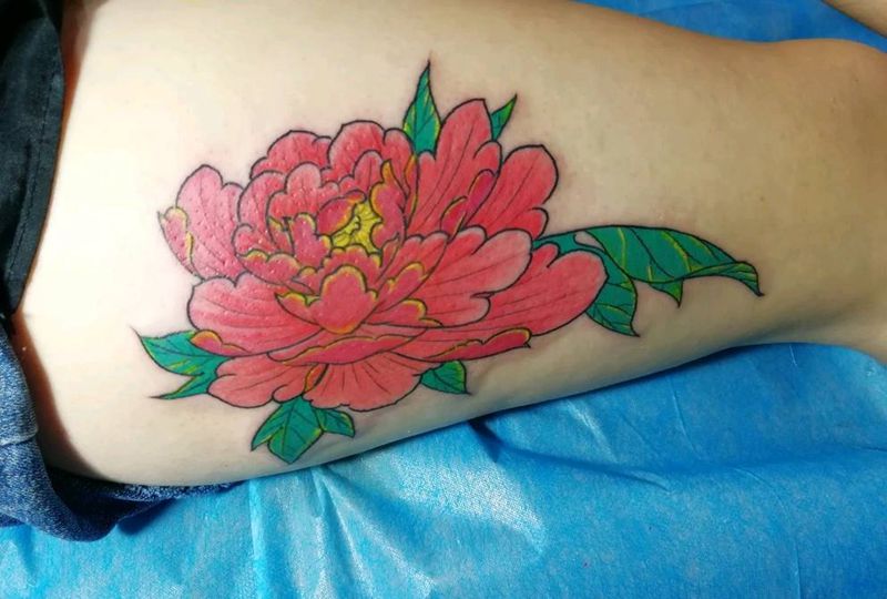 牡丹纹身图片_腿部新传统纹身图案
