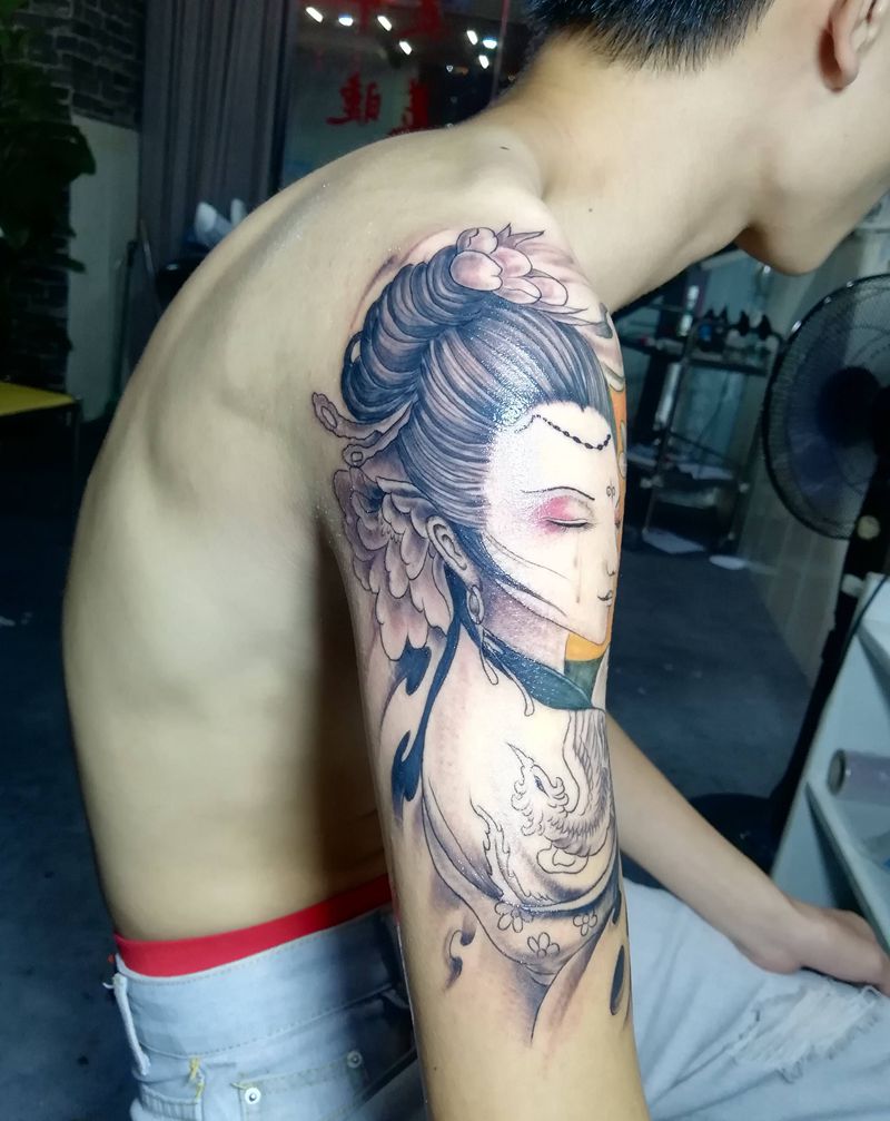 当前位置: 首页 >广东省惠州市纹身店-会龙堂纹艺纹身图案>落泪艺妓纹身图片_手臂新传统纹身图案