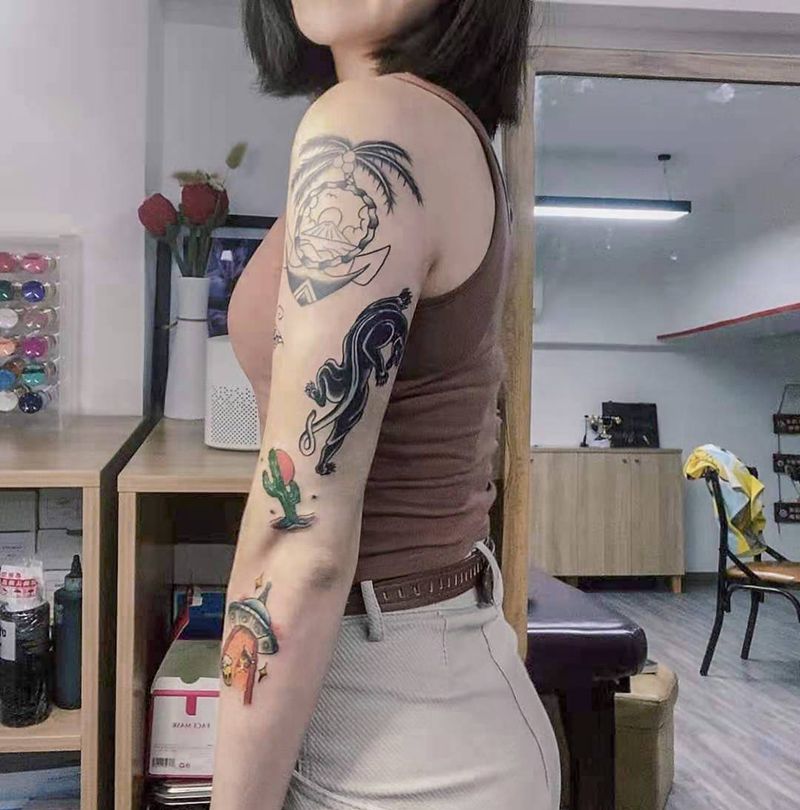 当前位置: 首页 >广东省梅州市纹身店-小八刺青工作室纹身图案>拼接花臂纹身图片_手臂Old School纹身图案