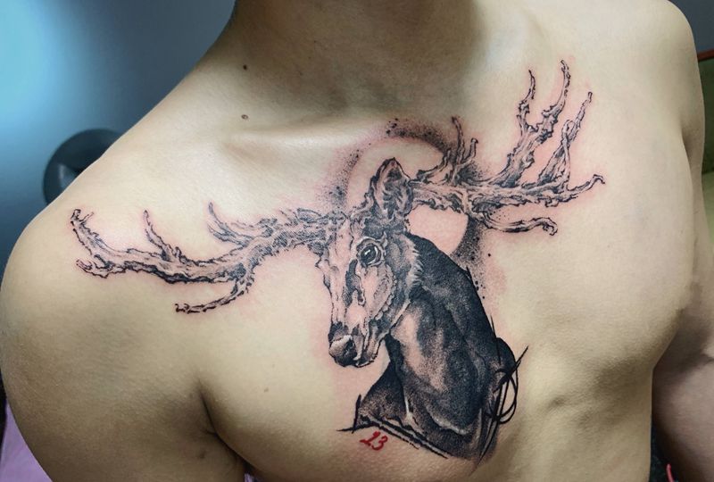 【心中的鹿·13】纹身图片_胸部水墨点刺纹身图案