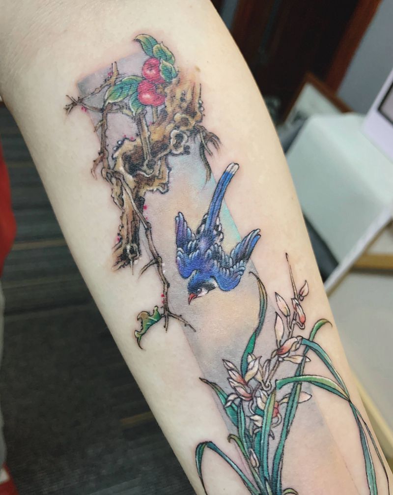 当前位置: 首页 >广东省汕尾市纹身店-丰翼轩刺青纹身图案>【见喜·小国画系列】纹身图片_手臂水彩水墨国画纹身图案