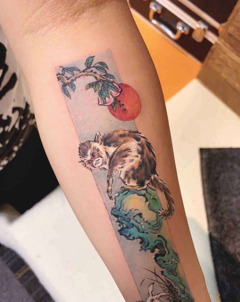 当前位置: 首页 >广东省汕尾市纹身店-丰翼轩刺青纹身图案>【游必有方】小国画系列纹身图片_手臂新传统水彩传统国画纹身图案